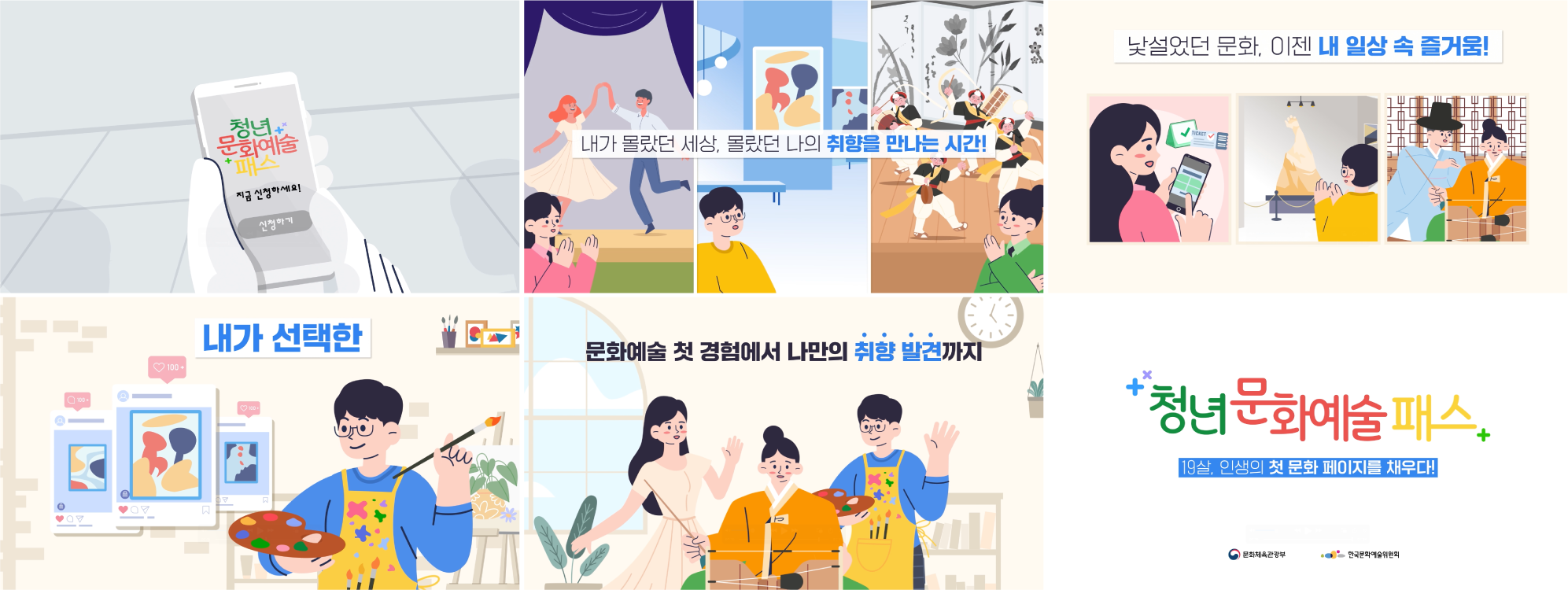 문화예술을 처음 접하는 19세 청년들의 설렘을 따뜻한 일러스트 스토리텔링으로 연출했습니다. 패스 신청 방법과 혜택을 직관적으로 전달하기 위해 텍스트와 이미지의 가독성을 극대화했습니다. 타깃의 공감을 이끌어낼 수 있는 경쾌한 톤앤매너를 적용하여 사업의 긍정적 이미지를 강조했습니다.