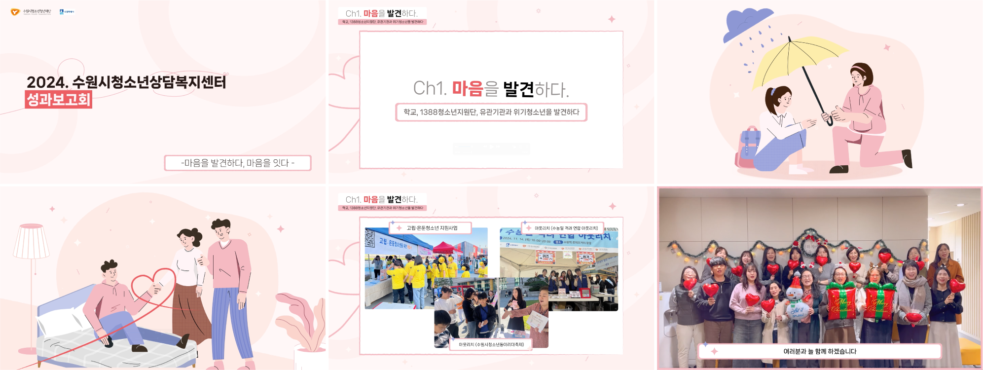 위기 청소년 발굴부터 지원까지의 과정을 감성적인 일러스트로 연출했습니다.다양한 복지 프로그램을 챕터별로 구성하여 주요 성과를 명확히 시각화했습니다.센터의 진심 어린 메시지가 돋보이도록 부드러운 톤앤매너를 적용했습니다.