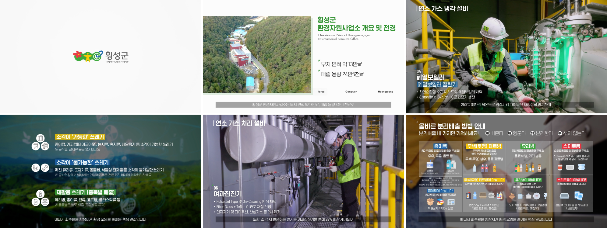 횡성군 생활폐기물 및 음식물 처리시설의 개요와 고효율 소각 시스템의 공정 과정을단계별 그래픽으로 구성했습니다. 에너지 회수와 환경 보호의 가치를 강조하며지속 가능한 도시 횡성의 비전을 담아냈습니다.