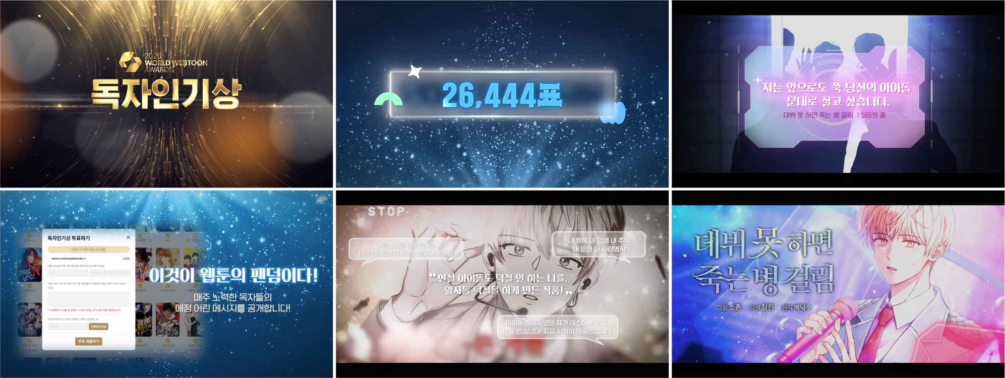 작품의 41.2%라는 높은 득표율과 독자 투표 결과를 데이터 그래픽으로 연출했습니다.팬덤의 감성을 자극하는 M/V 스타일로 제작했으며, 전 세계 러뷰어(팬덤)들의실제 응원 메시지를 자막으로 노출하여 '독자인기상'의 의미를 극대화했습니다.